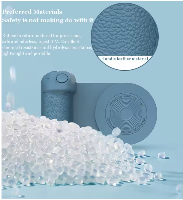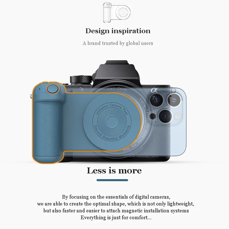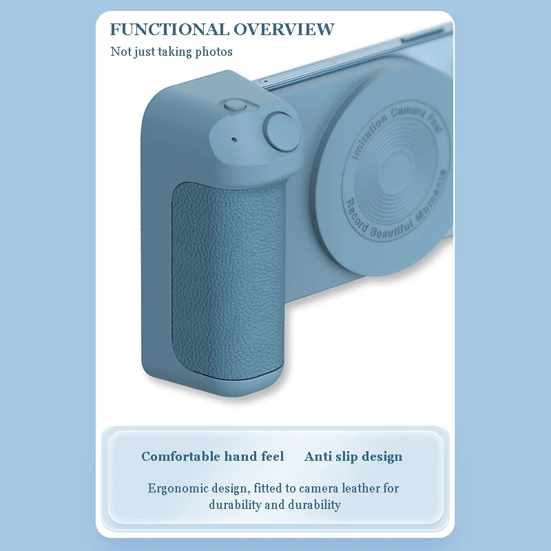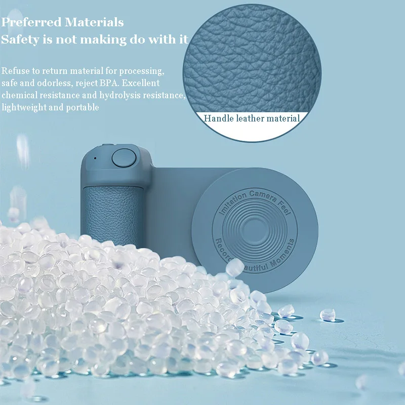 Camera Grip Photo Holder Inspired by imitating the camera grip for more stable photos for magsafe magnetic attachment for the back of the phone Not just a photo stand, but a desk stand Product Instruction: Press and hold the power button for 2 seconds, the blue indicator light flashes, and then turn on the BT of the mobile phone to connect to the BT device named BBC-8. After the connection When not in use, press and hold the switch for 2 seconds, the indicator light will turn off, indicating that it has been turned off! When the battery is low, it will automatically shut down. At this point, the product needs to be charged. The red indicator light is always on when charging, and the indicator light is off when fully charged. Charging time is about 2.5 hours. Inspired by the camera handle, making the shooting more stable Magnetic adsorption on the back of the phone, convenient to use Not just a selfie bracket but also is a desktop phone stand Designed with wireless charging function, charge your phone easily With BT shutter function, press the button on the handle to shoot easily Model: BBC-8 Size: 11.2*8.3*3.5cm Material: ABS+Magnet+PU Battery capacity: 200mAh Input interface: Type-C Rated voltage: DC/5V Rated current: 2A Power: about 10W |