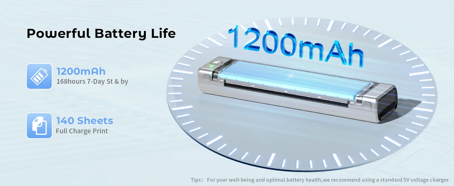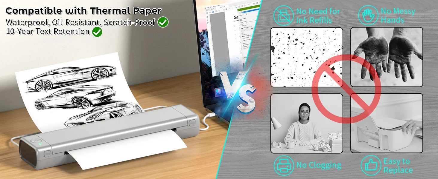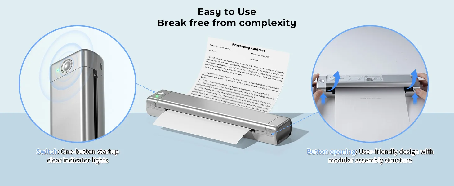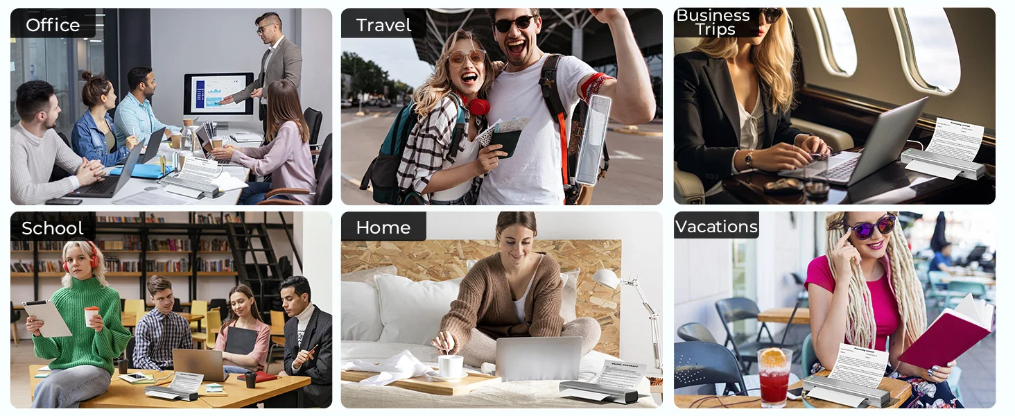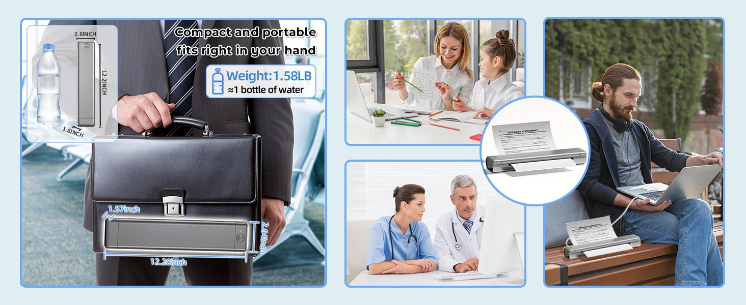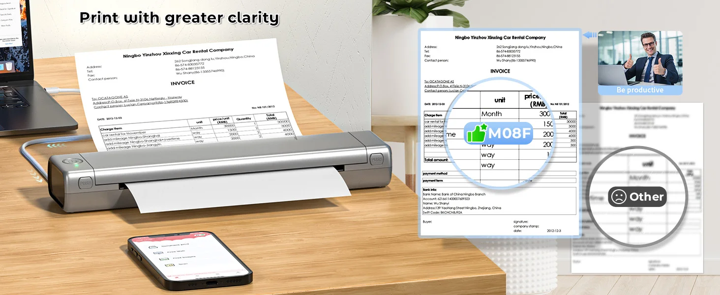 * Compact Design - Phomemo M08F-A4 Portable Printer is compact and portable, 80% smaller in size and weight than traditional printers, effortless to hold with one hand. The thermal printer is suitable for any scenarios that require mobile printing in business/travel/car/office/school. For example, print invoices, exam documents, lists and contracts on site.