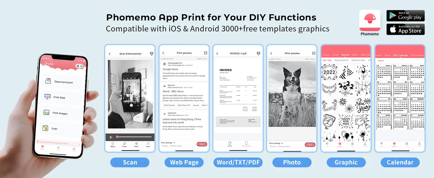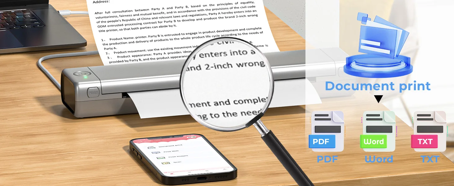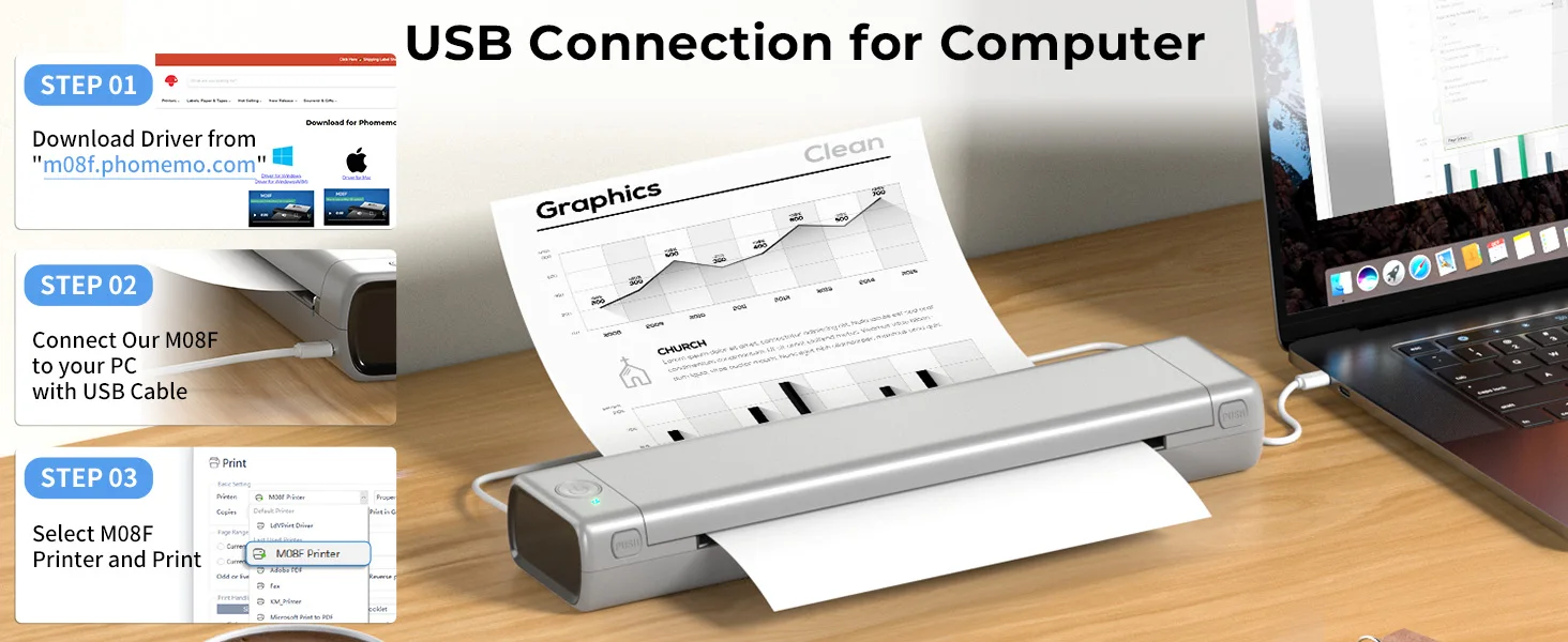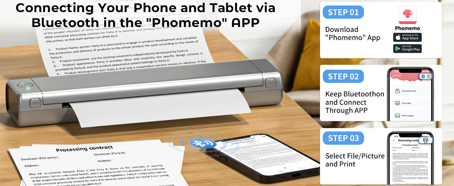 * Mobile Device Printing - Phomemo M08F Portable Printer features advanced wireless Bluetooth technology. Easily print from your iPhone, iPad, or Android with the Phomemo App.